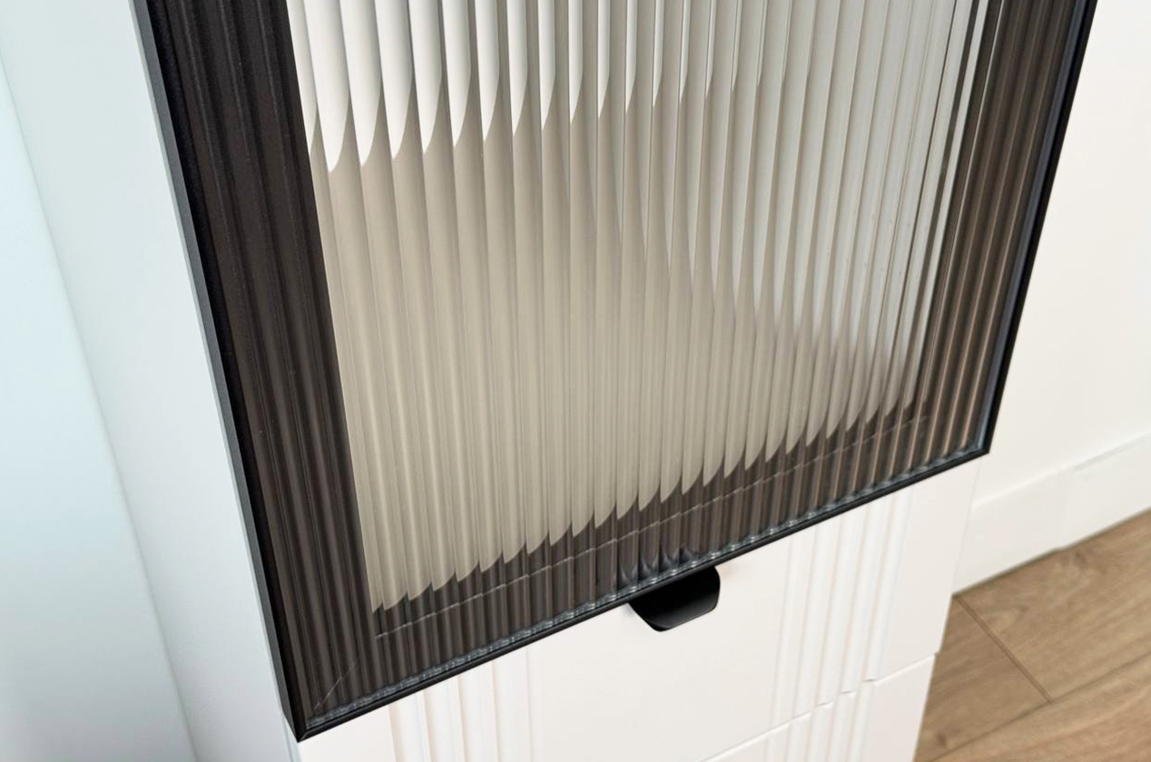 • Внутреннее наполнение: Полки за стеклянной и глухой дверцами, а также выкатной ящик для эффективного использования пространства.