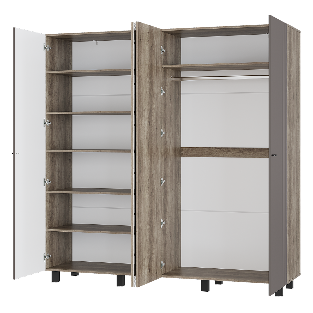· Вместительность: Четыре просторные створки, множество полок, две штанги и выдвижные ящики.