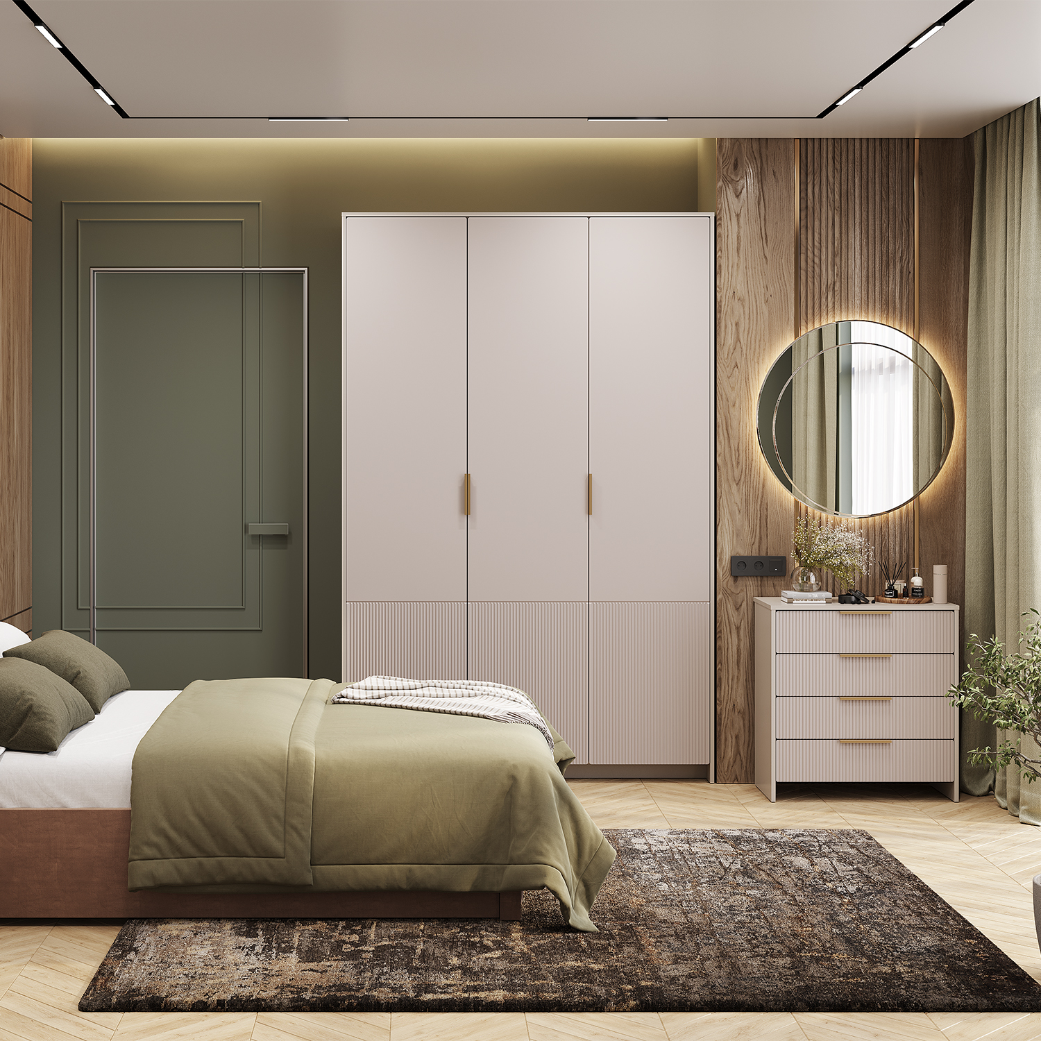 Трендовые пастельные оттенки «кашемир» и «айриш» создают спокойную и уютную атмосферу. Особую изюминку шкафу придает дизайн фасадов из МДФ: верхняя часть — гладкая и матовая, а нижняя декорирована изящной вертикальной фрезеровкой. Этот прием создает интересный визуальный контраст, структурирует пространство и подчеркивает текстуру материала.