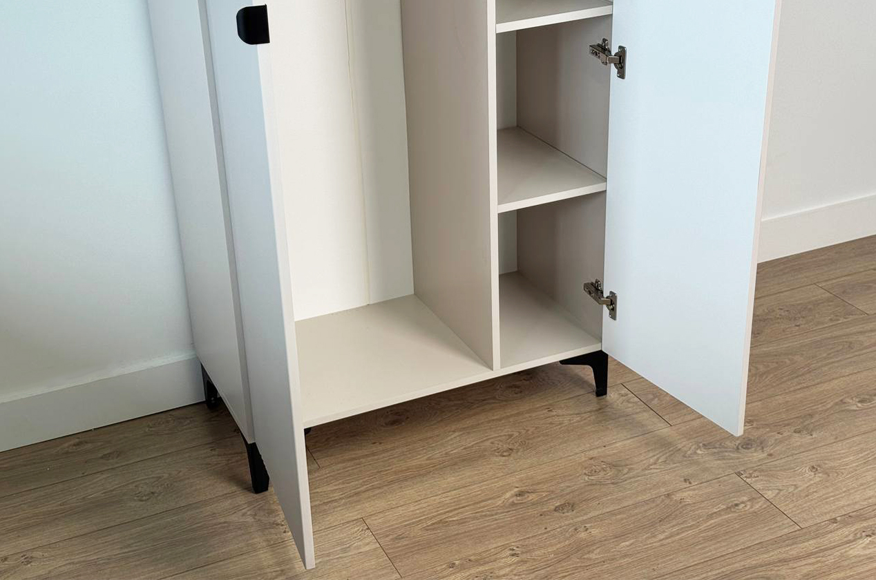 • Умная организация: Продуманное внутреннее пространство с полками и штангой для вешалок позволяет удобно хранить разные типы вещей.