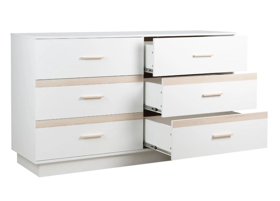 Просторный комод из модульной коллекции "Анона" с массивной столешницей и шестью вместительными ящиками на плавных шариковых направляющих – идеальное решение для спальни. Его устойчивая поверхность позволяет разместить даже телевизор.