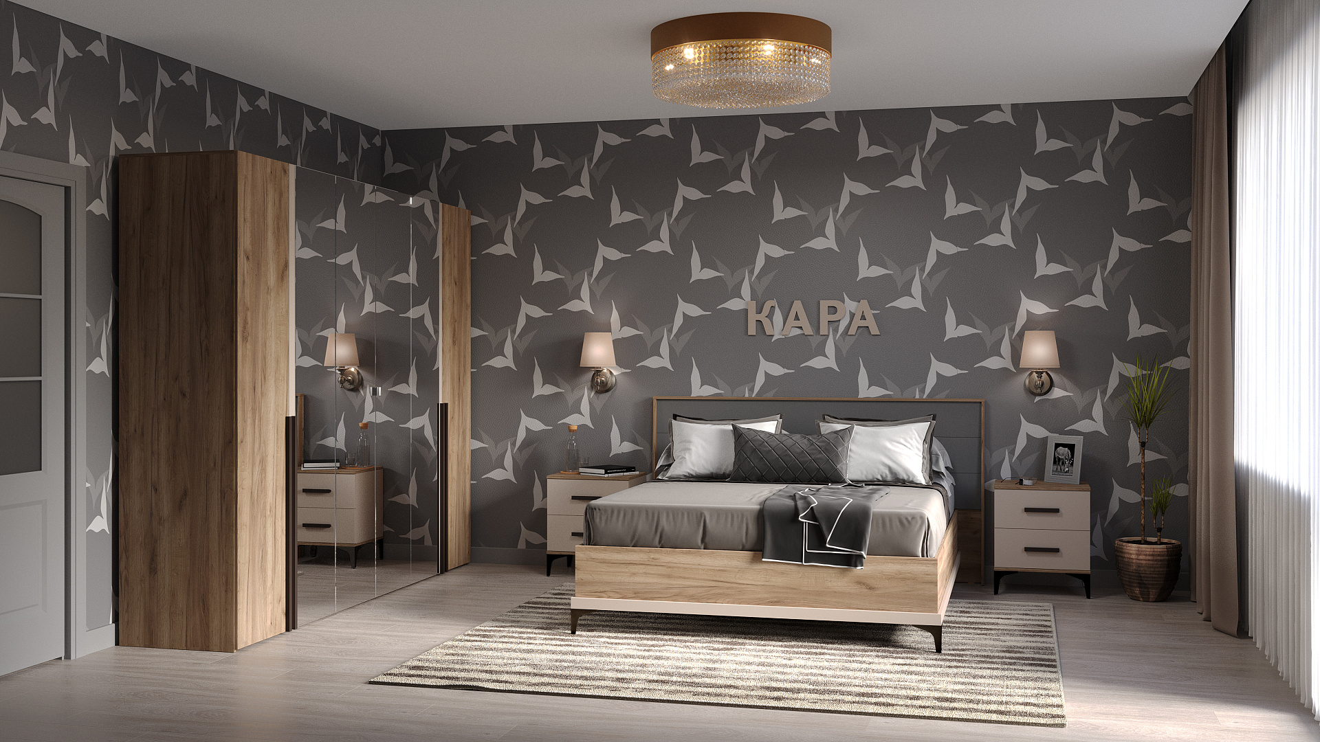 Модульная спальня "Кара" сочетает в себе элементы современного восточного стиля, уникальность и продуманную функциональность. Объединение в дизайне темного древесного декора, контрастного велюра и антрацитовых оттенков, создает идеальный образ для вашего личного пространства.